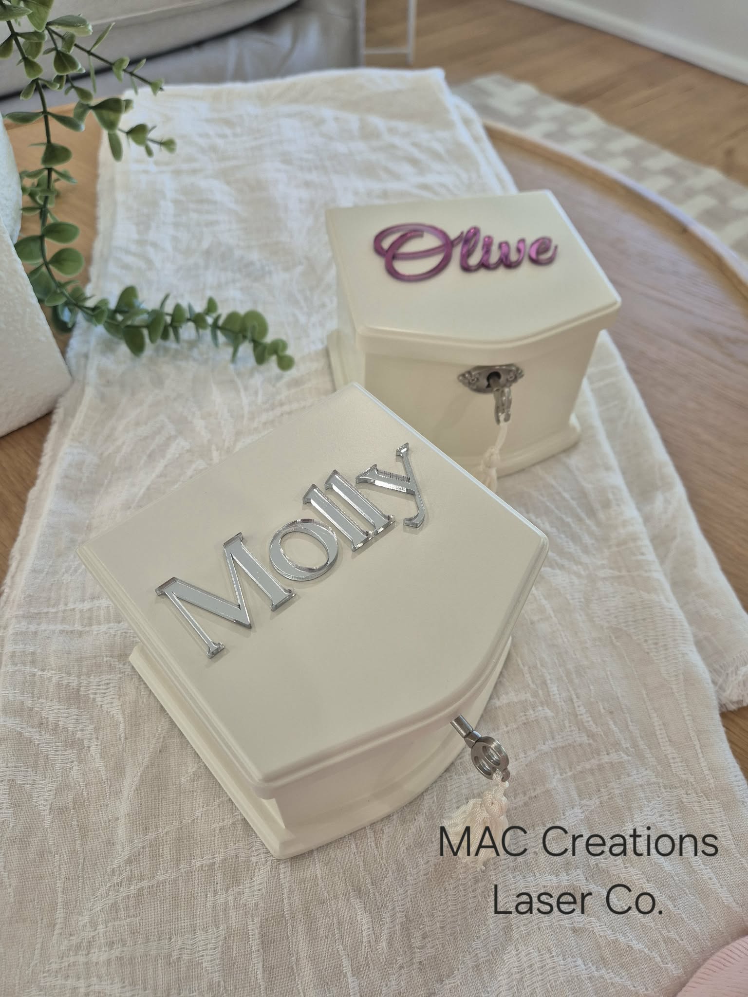 Each box is lovingly personalised with a custom acrylic name, making it a truly special gift for birthdays, flower girls, christenings, or just because. The raised acrylic lettering adds a modern touch to this timeless piece, creating a keepsake to be cherished for years to come.